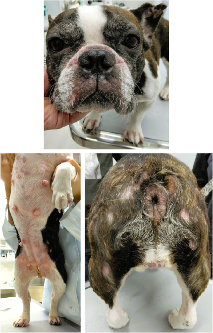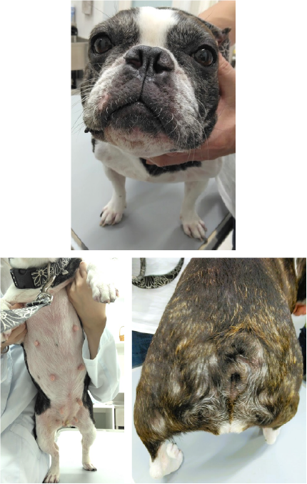 当院の初診時の皮ふの状況は、胸~お腹とお尻に円形のかさぶたの細菌感染の症状が多数みられ、お顔や尻尾のひだの部分も赤く痒みがありました。
