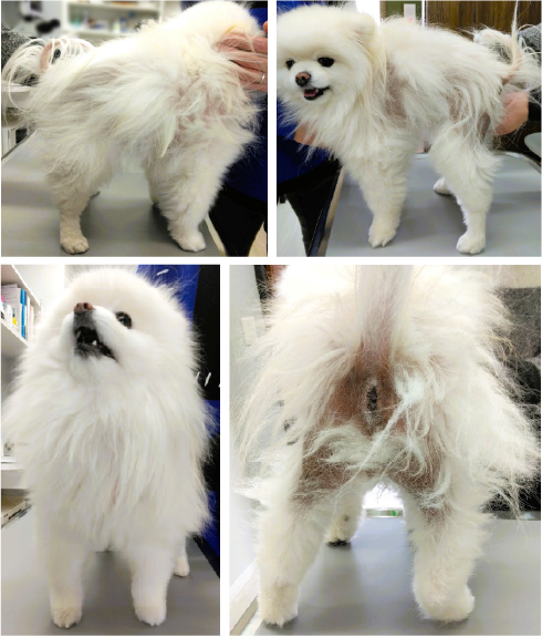 毛周期停止(ポメラニアン脱毛症・アロペシアX)の症例初診時は首まわり、胸、腰まわり、お尻、大腿後面の毛が薄く、肌も見えている部分もありました。毛量も全体的にやや少ない印象です。